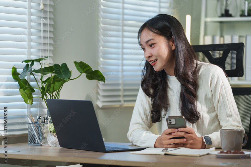 Smiling young asian businesswoman using laptop and mobile phone while working remotely from home sitting at her desk in a bright home office