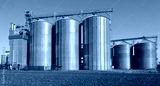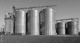 Grain storage bins with silos and distribution system with plowed land in front on wintertime