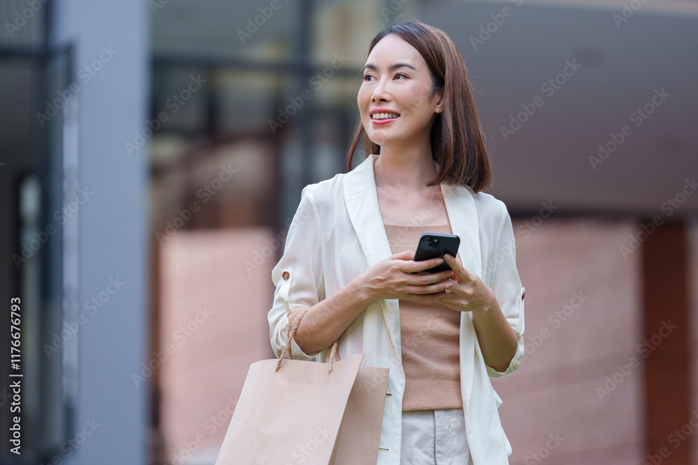 Smiling businesswoman is holding a shopping bag and using a smartphone, looking away and enjoying a day of shopping and leisure in the city