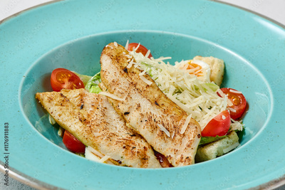 Vibrant Caesar Salad with Grilled Chicken in Energetic Color Palette