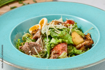 Minimalist Roast Beef and Baked Potato Salad with Mushrooms in Vibrant Color Palette