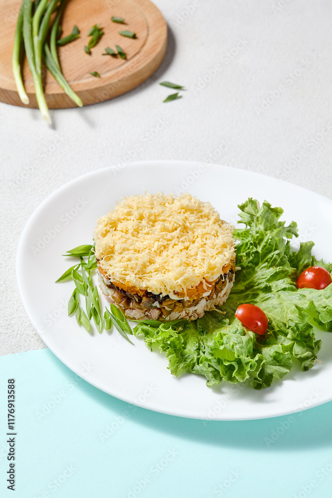 Layered Round Salad with Cheese, Mushrooms, and Ham – Fresh and Vibrant Culinary Art