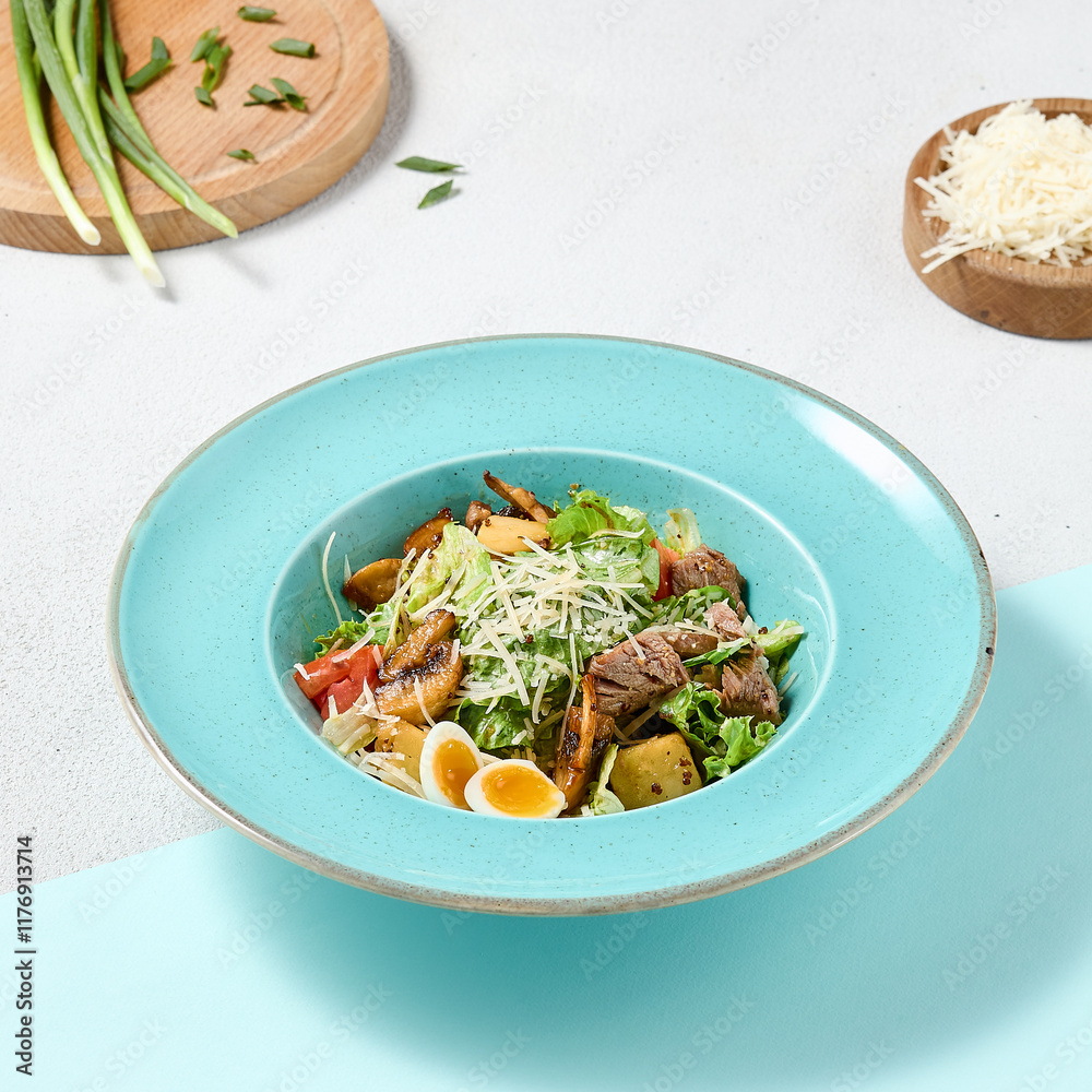 Minimalist Culinary Art Roast Beef, Baked Potato, and Mushroom Salad