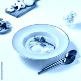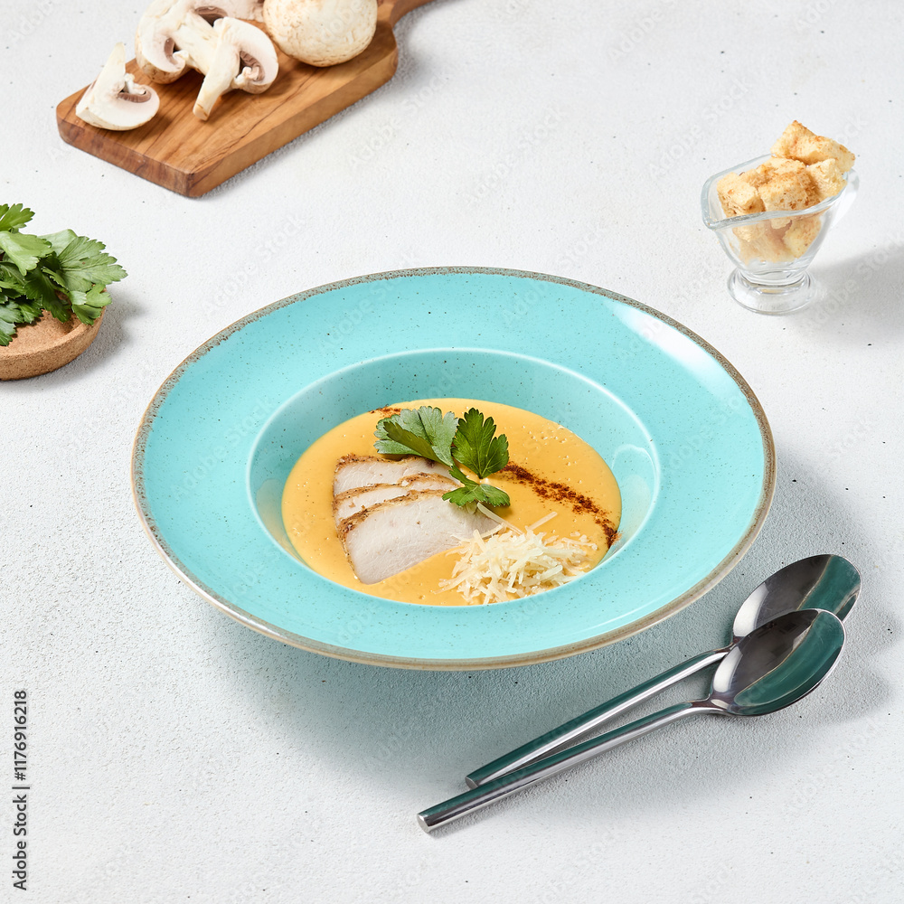 Elegant Pumpkin Cream Soup with Chicken and Parmesan in Minimalist Setting