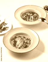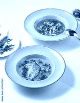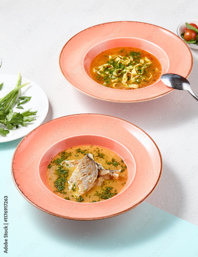 Gourmet Soup Composition Vibrant Bouillabaisse and Noodle Presentation in Warm Tones