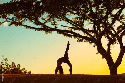 The art of flexibility. Female gymnast doing advanced yoga in the park.
