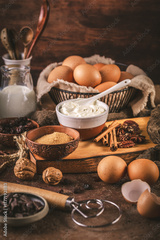 Assorted baking ingredients and kitchen utensils in brown tone
