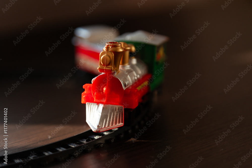 Toy train engine on a track, close-up view. Red and green cars, classic design.