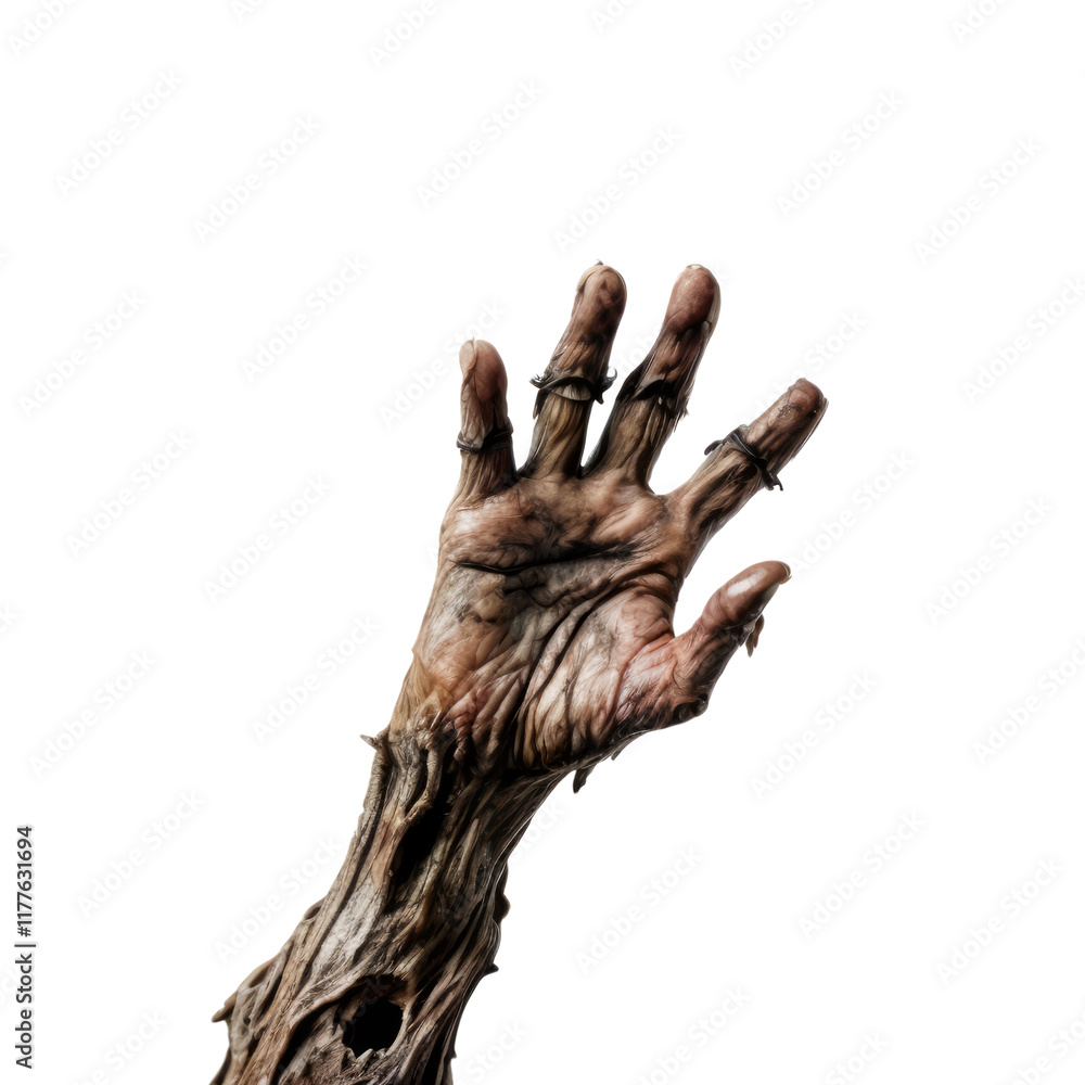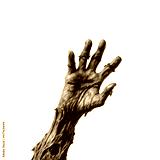 Reaching From The Grave: A decaying, withered hand, covered in thorns and dirt, reaches out from the abyss. The image evokes a sense of fear, dread, and the macabre.
