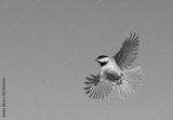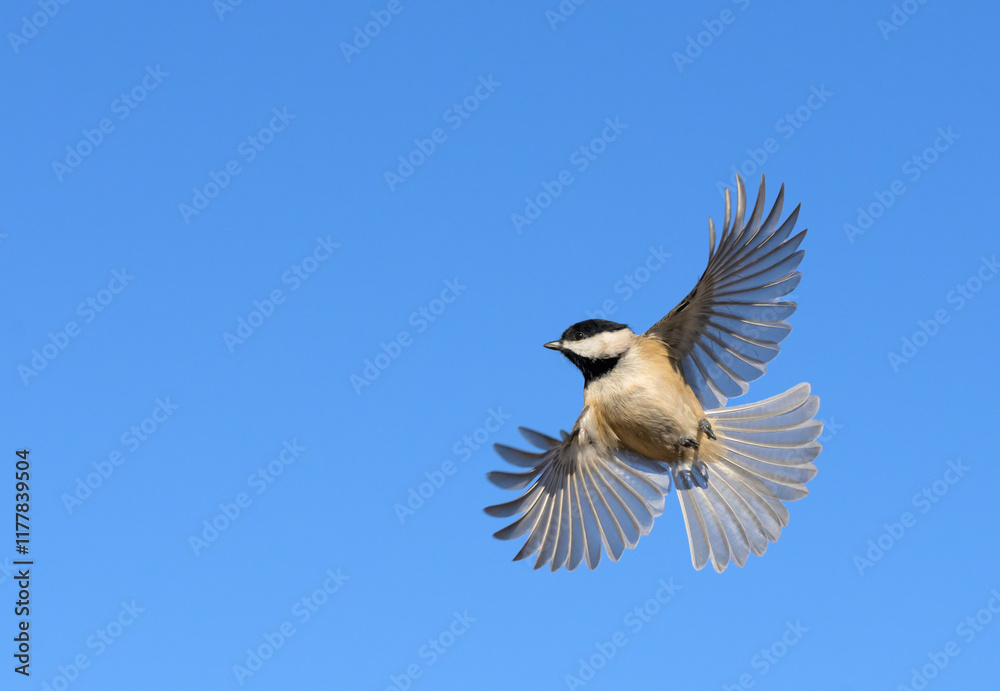 Carolina Chickadee in flight; undeside view with wings and tail spread out, against clear blue sky, with copy space