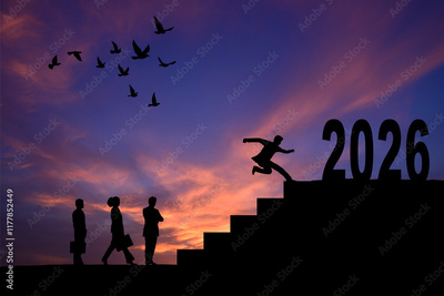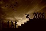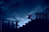 People running up the stairs to 2026. 2026 New Year concept. New year's card 2026. Start a new business in new year.