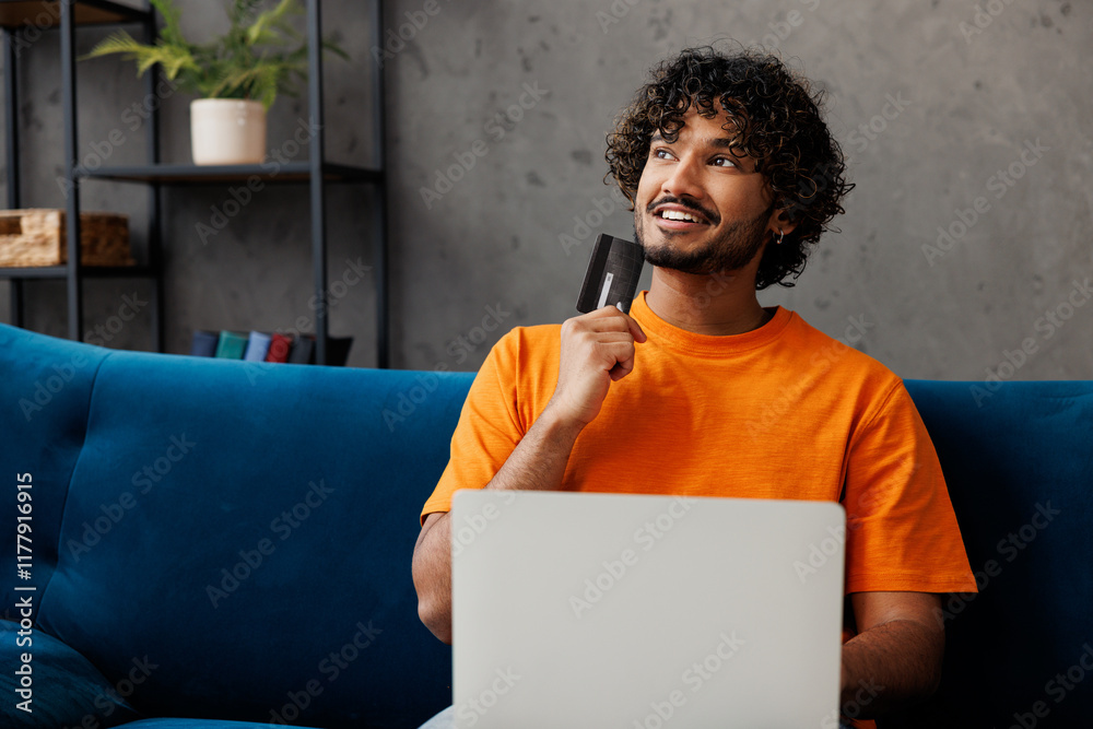 Young Indian man wear orange casual clothes sits on blue sofa couch use laptop pc computer hold credit bank card shopping online stay home hotel flat rest relax spend free time in living room indoor.