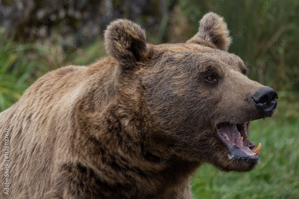 Grizzly or North American brown bear, Ursus arctos horribilis, walking in grass meadow with blurred mountainous and sky background isolated on white background, looks at camera
