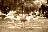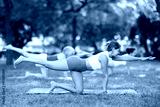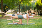 Sporty energetic females doing exercises on pilates mat during group training in green park at daytime. Fitness concept