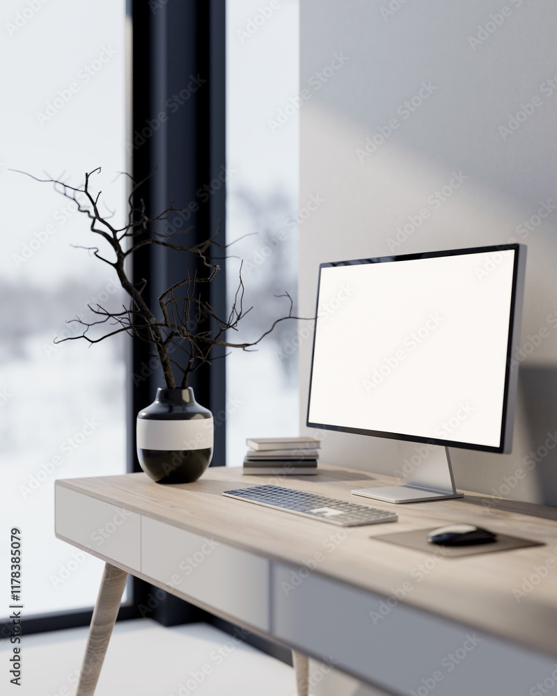 Computer and a black ceramic vase with dried branches placed on a table in a white, minimalist room.