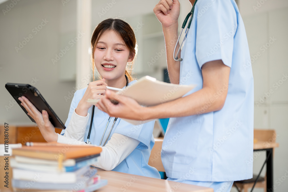 A beautiful Asian female medical is discussing work with her classmate in a library.