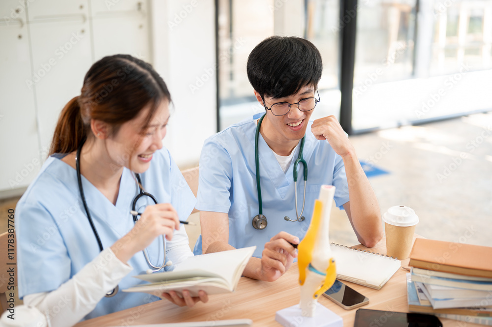 A female medical student is examining a model of bone joints and discussing it with her classmate.