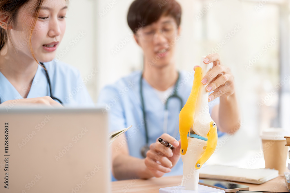 A female medical student is examining a model of bone joints and discussing it with her classmate.