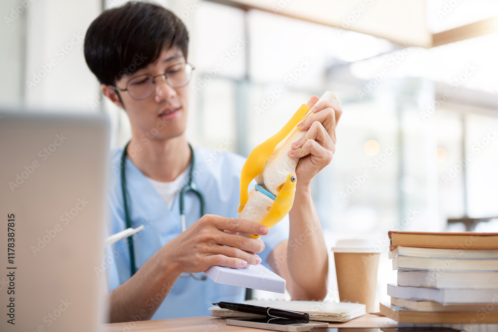 A smart Asian male medical student in scrubs is examining a model of bone joints.