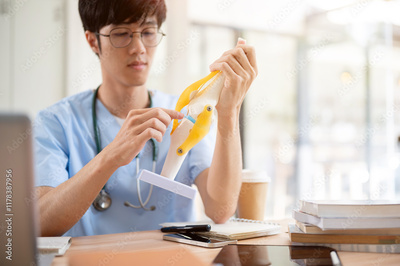 A smart Asian male medical student in scrubs is examining a model of bone joints.