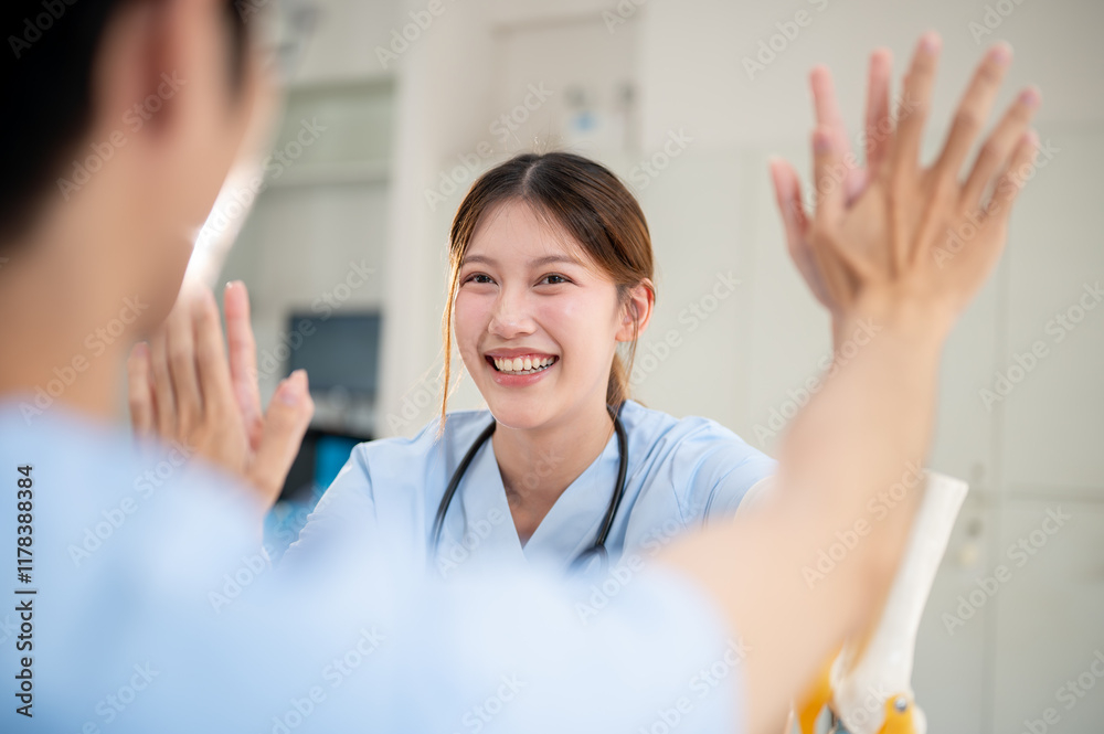 A cheerful, smiling Asian female medical student is giving a high five to her male classmate.