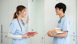 Two Asian male and female medical students are talking while getting their textbooks from a locker.