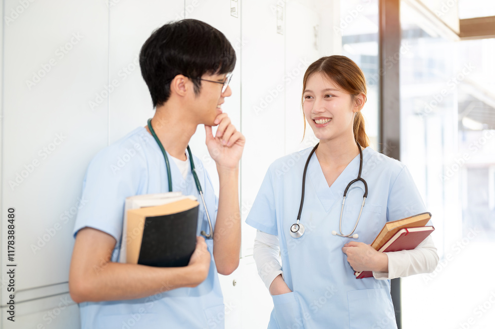 Two happy Asian male and female doctors are standing and talking in the locker room.