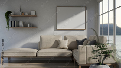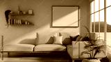 A cozy, minimalist beige living room featuring a large white sofa and minimalist home decor.