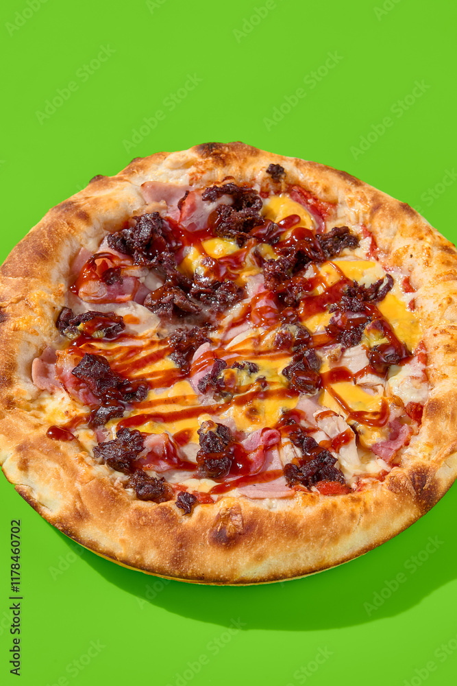 Closeup side view of a meaty American pizza with thick crust, sausage, bacon, and marbled beef on a bright green minimalist background. Perfect for modern food photography, takeout, or casual dining.