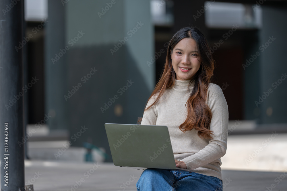 Young asian freelancer woman working on a laptop while sitting on a bench in a modern building, enjoying the flexibility of remote work in an urban setting