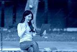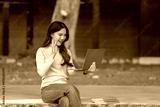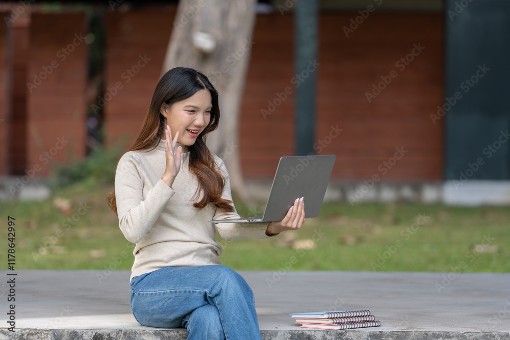 Happy young asian woman waving at her laptop during a video call, sitting outdoors on campus surrounded by notebooks, enjoying the vibrant atmosphere of learning and connection