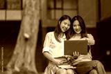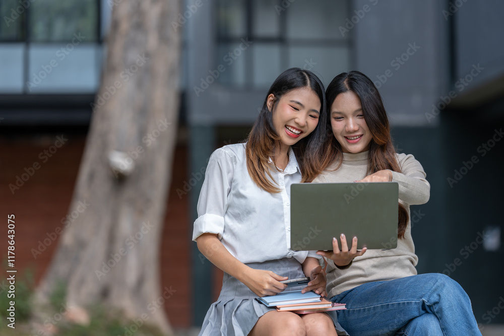 Two young female students are sitting outdoors on a campus bench, sharing a laptop and smiling as they collaborate on a project, enjoying the pleasant university atmosphere