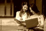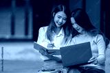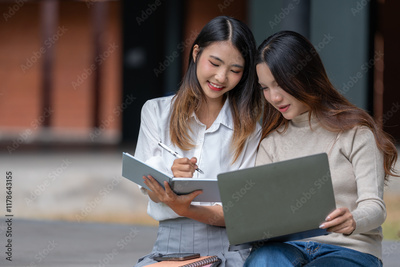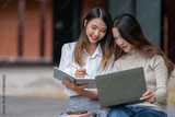 Two young businesswomen are collaborating on a project, using a laptop and taking notes in a notebook, while sitting outside a modern building