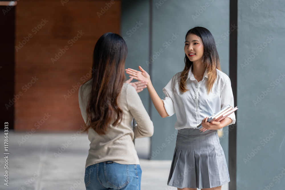 Two young female students are greeting each other with a friendly wave and smile while holding books, enjoying the campus atmosphere during their break