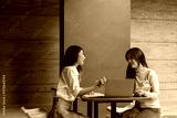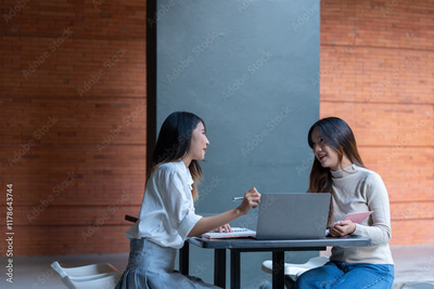 Two young businesswomen are sitting at a table, discussing work and using a laptop, collaborating on a project in a modern office environment with a wooden and grey wall