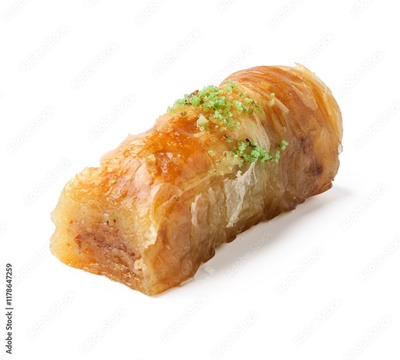 Delicious baklava dessert featuring layers of pastry, nuts, and honey on a clean white background