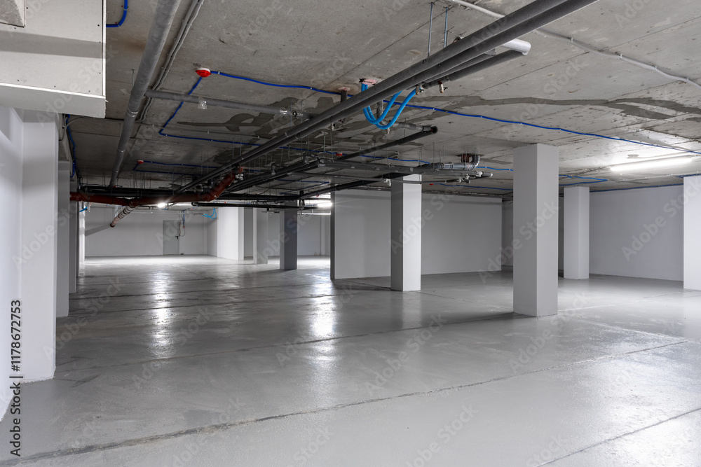 Empty underground parking garage with exposed pipes and clean concrete floors in a modern structure