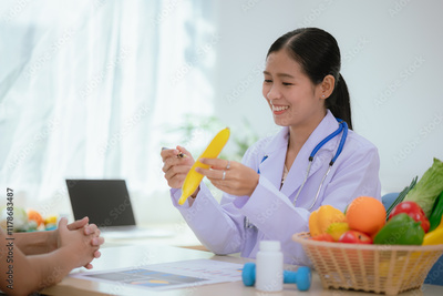 Nutritionist giving consultation to patient with healthy fruit and vegetable, Right nutrition and diet concept