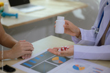 Nutritionist giving consultation to patient with healthy fruit and vegetable, Right nutrition and diet concept