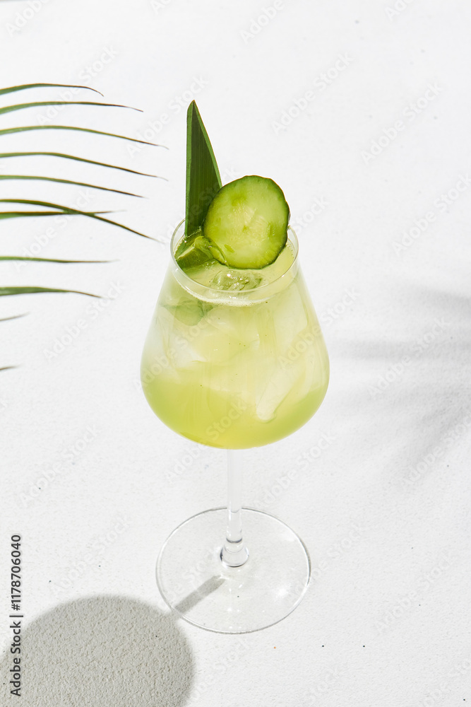 Cucumber cocktail in wine glass on white concrete background with shadows. Fresh mocktail in minimal style with tropical leaves. Alcoholic drink with gin and cucumber on summer menu. Summer drink.