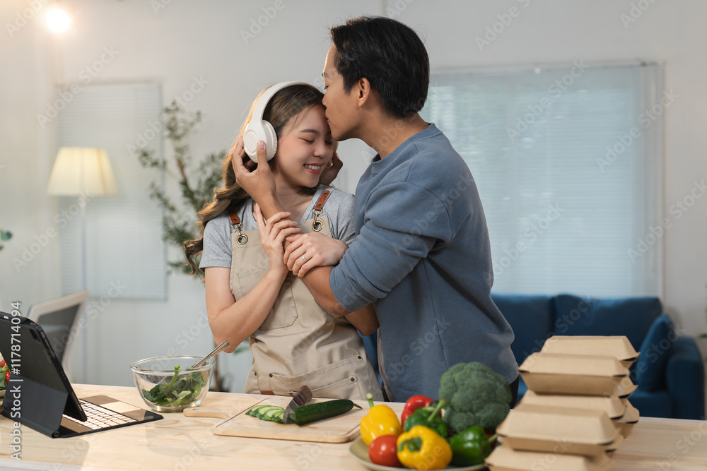 Young man kissing his girlfriend on the forehead while she enjoys music through headphones and prepares a healthy meal in a modern kitchen filled with fresh vegetables