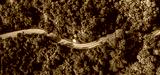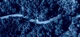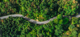panoramic view of Green forest road , Adventure morning road trip in the forest, electric vehicle driving on asphalt road through green forest.