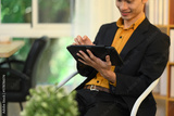 Handsome asian businessman in formal suit working on digital tablet at modern workplace