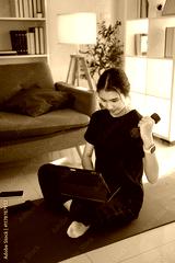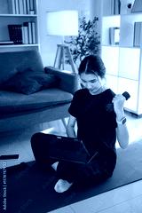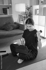 Young asian woman lifting a light dumbbell and using digital tablet on yoga mat