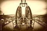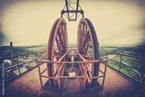 Vintage stylized fisheye lens photo of a mine shaft pulley wheel. Industrial detail background.