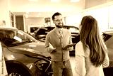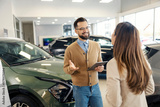Friendly car seller with tablet talking to a customer at car showroom.