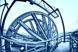 Vintage stylized fisheye lens photo of a mine shaft pulley wheel. Industrial detail background.