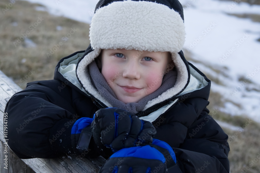 Close up portrait of a boy in winter outerwear against the backdrop of a snow-covered meadow