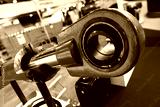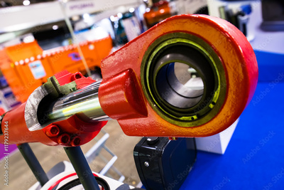 The image shows a fragment of a red hydraulic cylinder mounted on a stand. A part of the cylinder is cut away, showing the internal structure, including the piston and rod.