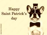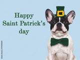 Happy St. Patrick's Day. Lovable, pretty puppy and bright green bow tie. Closeup, studio shot. Congratulations for family, loved ones, relatives, friends and colleagues. Pet care concept